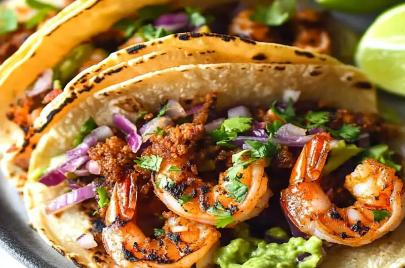 Start by marinating the shrimp for at least 15 minutes while you chop up your toppings—this maximizes flavor and efficiency. Sear the shrimp in a hot skillet until they turn pink and slightly charred, then assemble your tacos while they rest.