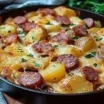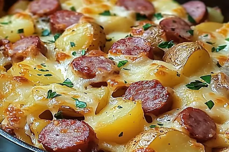 Cheesy Ranch Potatoes and Smoked Sausage is a comforting dish that perfectly blends crispy baby potatoes, savory smoked sausage, and creamy ranch seasoning. This crowd-pleaser is easy to prepare and ideal for family dinners or game day gatherings. Topped with melted cheese and garnished with fresh herbs, it’s as visually appealing as it is delicious. Enjoy every gooey bite while creating lasting memories around the dinner table.