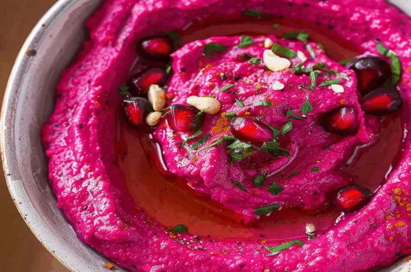 Pomegranate and Beet Hummus is a vibrant, nutrient-rich dip that elevates any snack time. The earthy sweetness of beets harmonizes with the tartness of pomegranate, creating a creamy texture perfect for pairing with warm pita or fresh veggies. Delightfully easy to prepare, this colorful hummus not only captivates the taste buds but also serves as an eye-catching centerpiece at gatherings. With its health benefits and versatile serving options, it’s destined to become a staple in your recipe rotation.