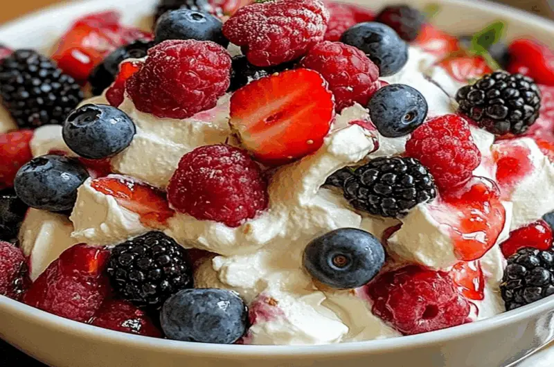 Berry Cheesecake Salad is a delightful dessert that combines the creamy texture of cheesecake with fresh, juicy berries. This dish typically features a mixture of cream cheese, whipped topping, and various berries like strawberries, blueberries, and raspberries. light and fluffy cheesecake The result is a light yet indulgent salad that is perfect for summer gatherings or as a sweet treat any time of the year. It’s easy to prepare and offers a refreshing twist on traditional cheesecake. For more inspiration, check out this Strawberry Cheesecake Cookies recipe.
