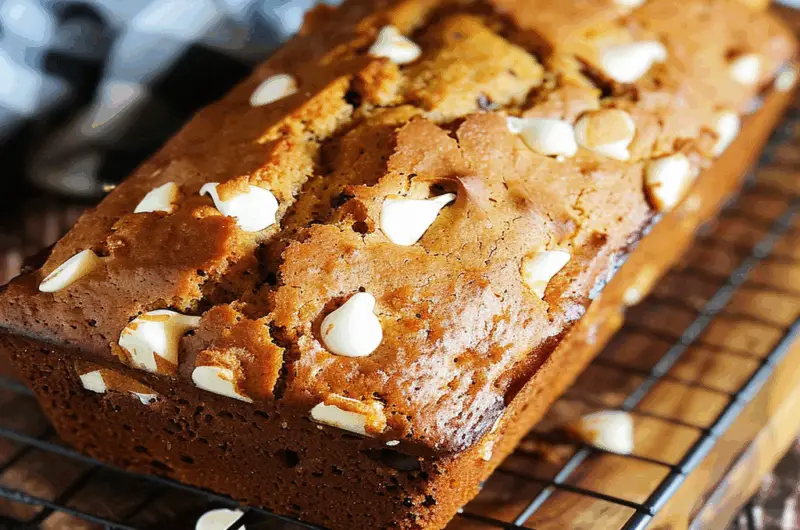 In summary, making pumpkin bread with white chocolate chips is simple and rewarding. With easy-to-find ingredients like pumpkin puree and white chocolate chips, this recipe results in a moist and flavorful treat perfect for any gathering or cozy night in. Remember to store it properly to maintain its freshness or consider experimenting with ingredient substitutions for unique flavors. Enjoy every slice of this delightful fall-inspired dessert!