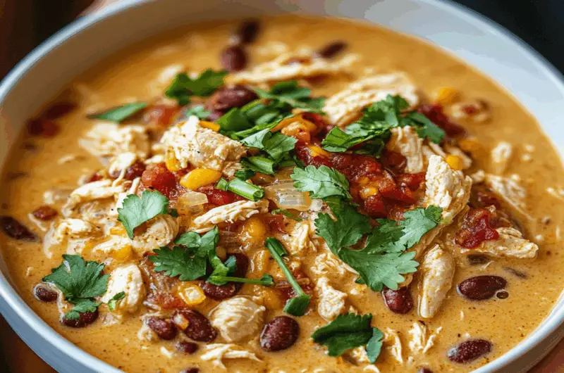 The aroma of Slow Cooker Cream Cheese Crack Chicken Chili wafts through the air, inviting you to indulge in a bowl of creamy goodness. Picture tender chicken swimming in a velvety sea of cream cheese and spices, topped with crispy bacon and gooey cheese. It’s not just a meal; it’s a hug in a bowl that warms your soul on chilly evenings. For more inspiration, check out this Macaroni Cheeseburger Soup recipe.