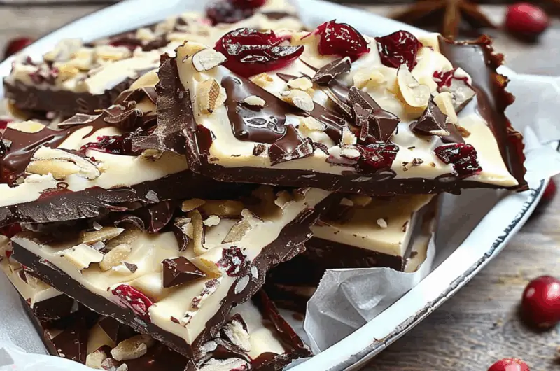 So there you have it—a delightful Thanksgiving dessert that marries rich chocolate with tangy cranberries in an easy-to-make bark form! Perfect for snacking while watching holiday movies or as an eye-catching addition to any dessert table. Enjoy every bite!